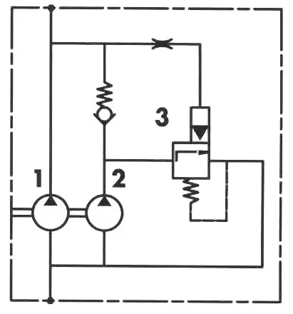 Гидравлические насосы представляют собой механические устройства, преобразующие механическую энергию в гидравлическую. Во многих системах требуется большой объем при низком давлении для быстрого перемещения тисков или инструмента, а затем небольшой объем и высокое давление для зажима или подачи. Это может быть достигнуто с помощью схемы «выше-ниже» с использованием двух насосов.